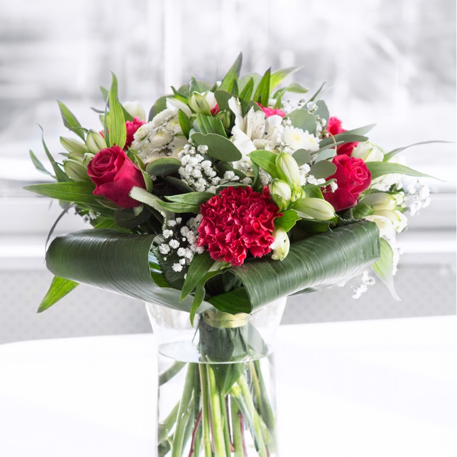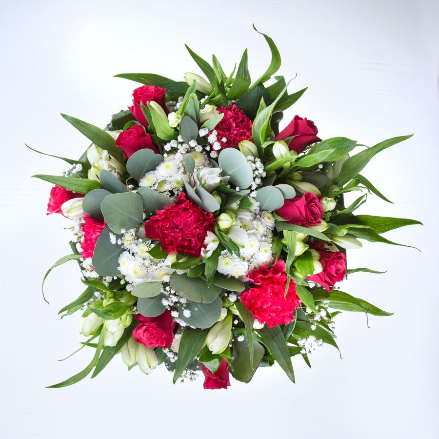 Discover the exquisite beauty of our unique floral arrangement, featuring white chrysanthemums, delicate gypsophila, vibrant red roses, lively carnations, elegant white alstroemeria, and lush aspidistra leaves. Each flower is hand-selected to guarantee unmatched freshness and quality.